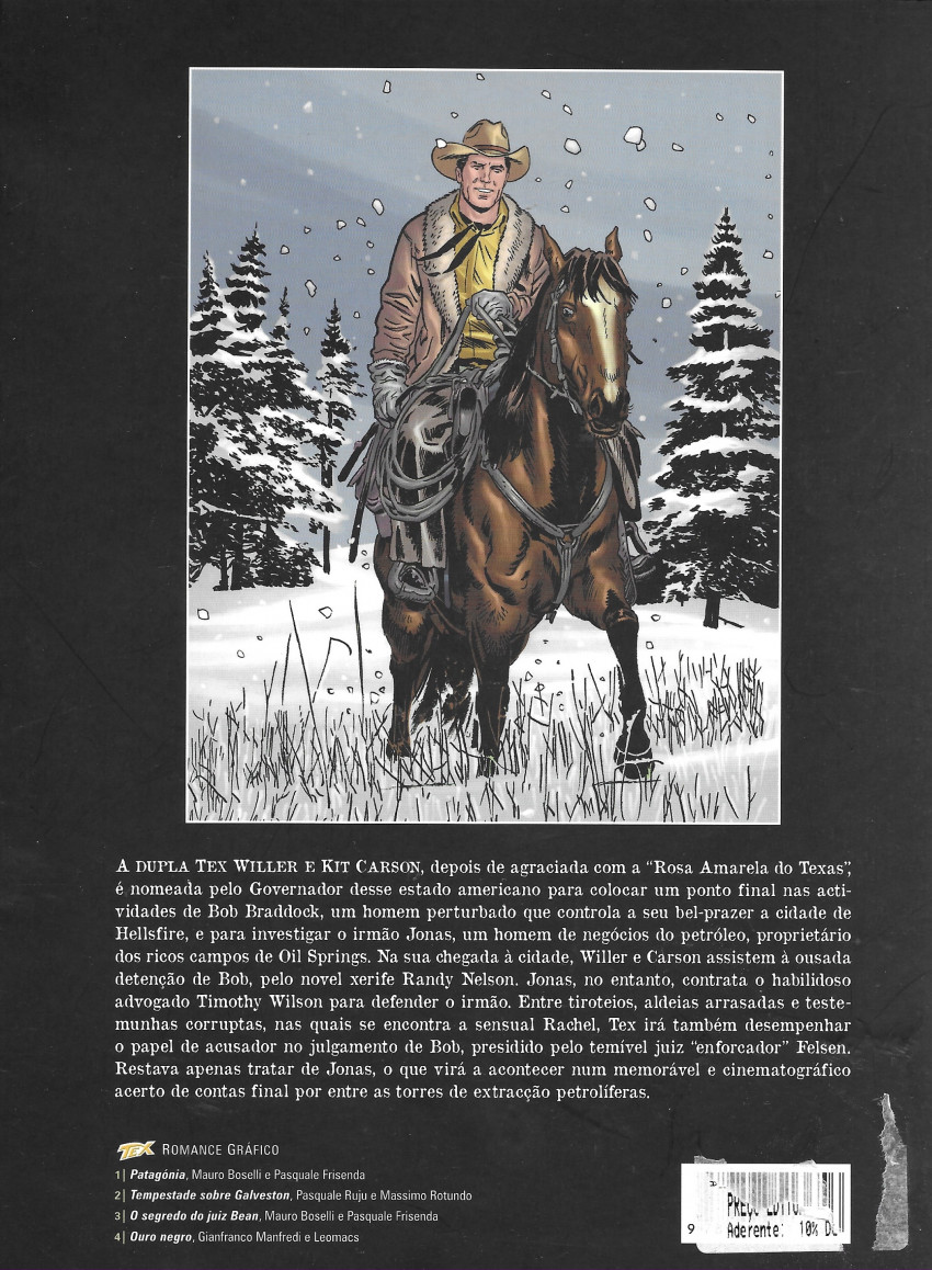 Résumé: A dupla Tex Willer e Kit Carson, depois de agraciada com a “Rosa Amarela do Texas”, é nomeada pelo Governador desse estado americano para colocar um ponto final nas actividades de Bob Braddock, um homem perturbado que controla a seu bel-prazer a cidade de Hellsfire, e para investigar o irmão Jonas, um homem de negócios do petróleo, proprietário dos ricos campos de Oil Springs. Na sua chegada à cidade, Willer e Carson assistem à ousada detenção de Bob, pelo novel xerife Randy Nelson. Jonas, no entanto, contrata o habilidoso advogado Timothy Wilson para defender o irmão. Entre tiroteios, aldeias arrasadas e testemunhas corruptas, nas quais se encontra a sensual Rachel, Tex irá também desempenhar o papel de acusador no julgamento de Bob, presidido pelo temível juiz “enforcador” Felsen. Restava apenas tratar de Jonas, o que virá a acontecer num memorável e cinematográfico acerto de contas final por entre as torres de extracção petrolíferas.