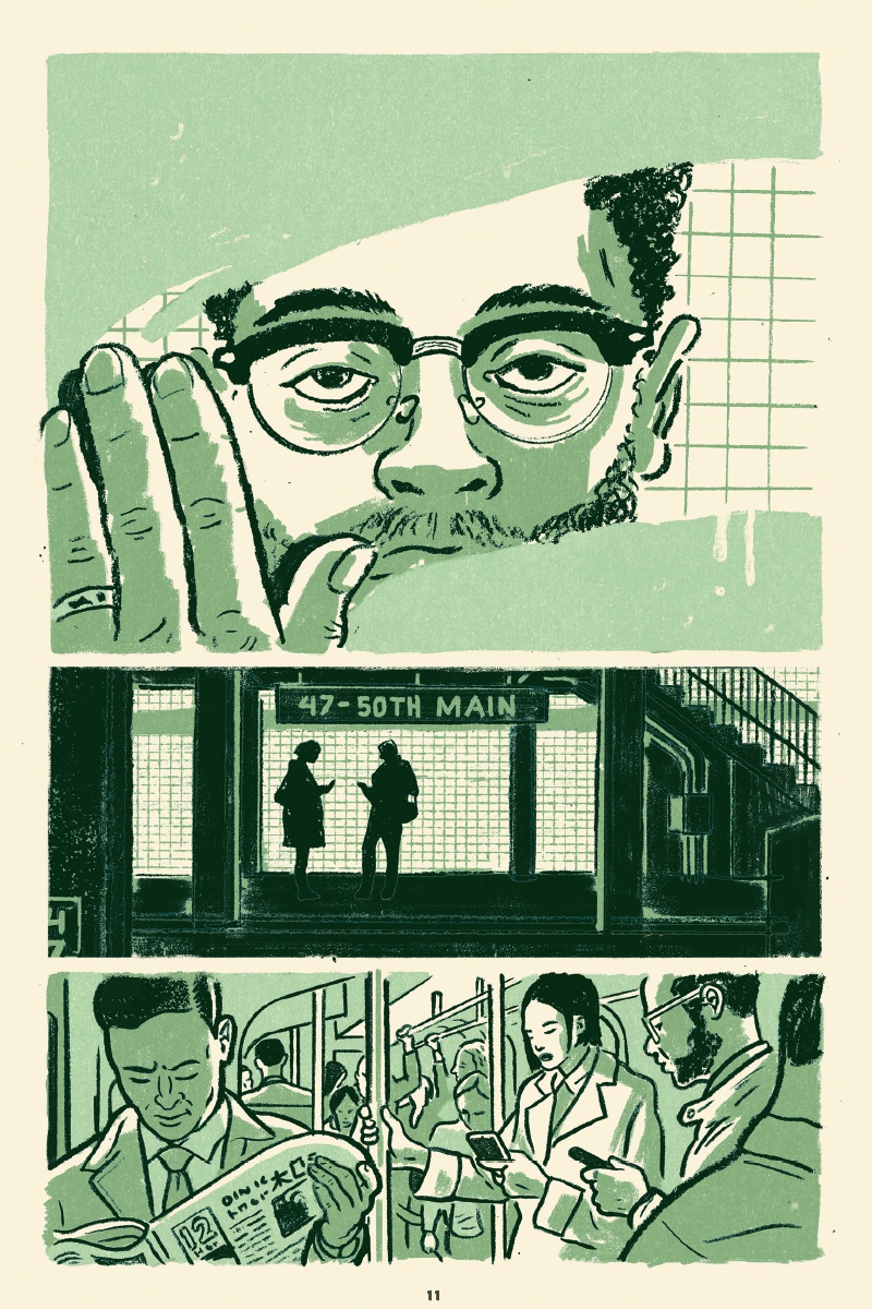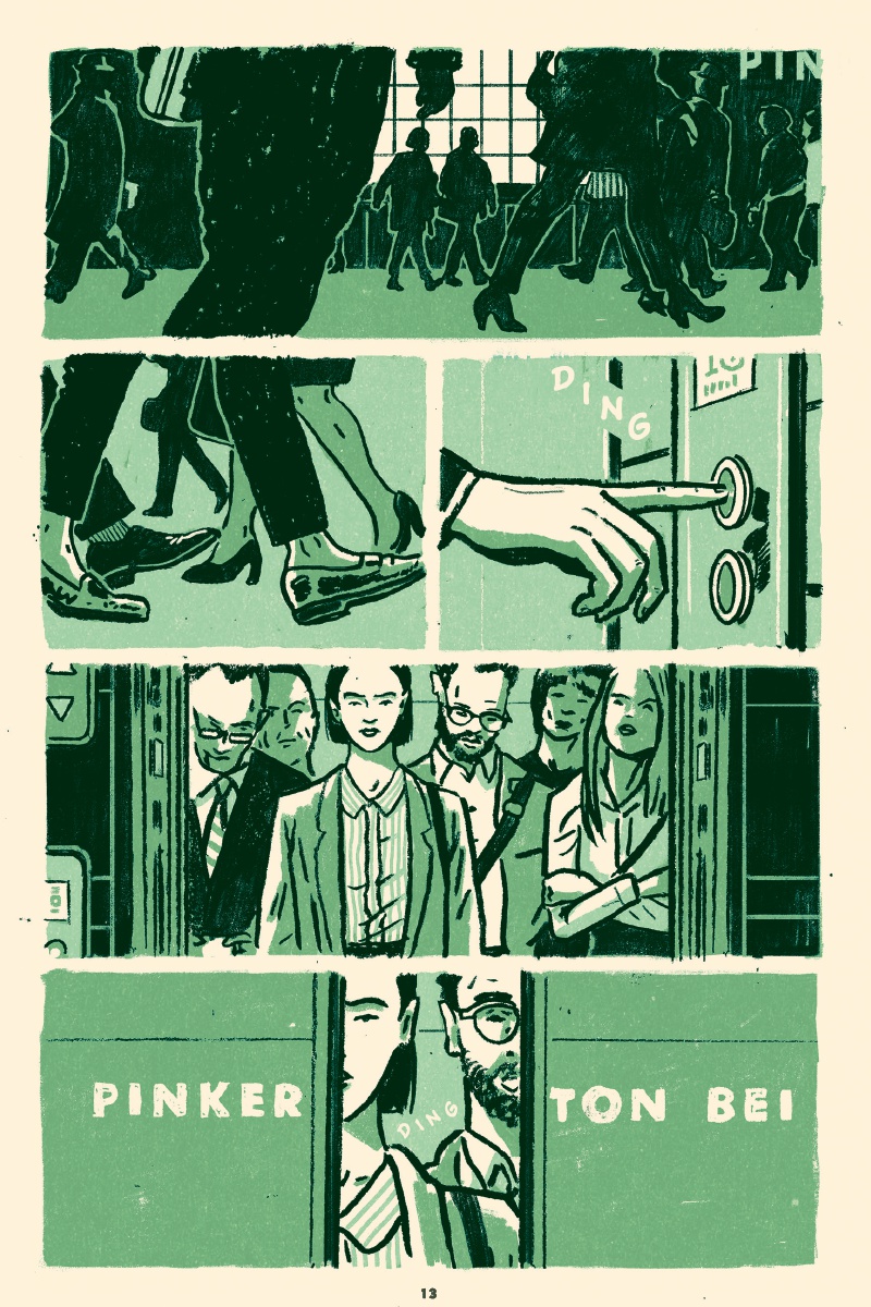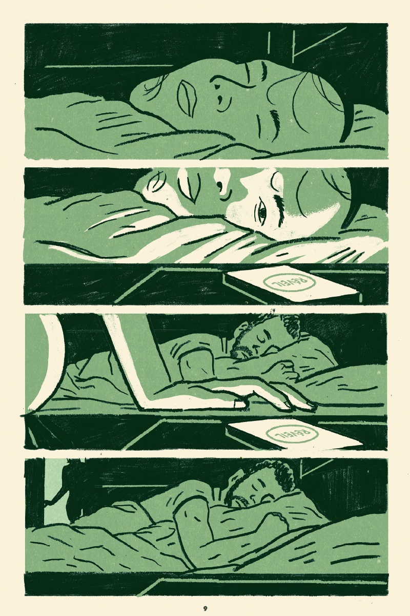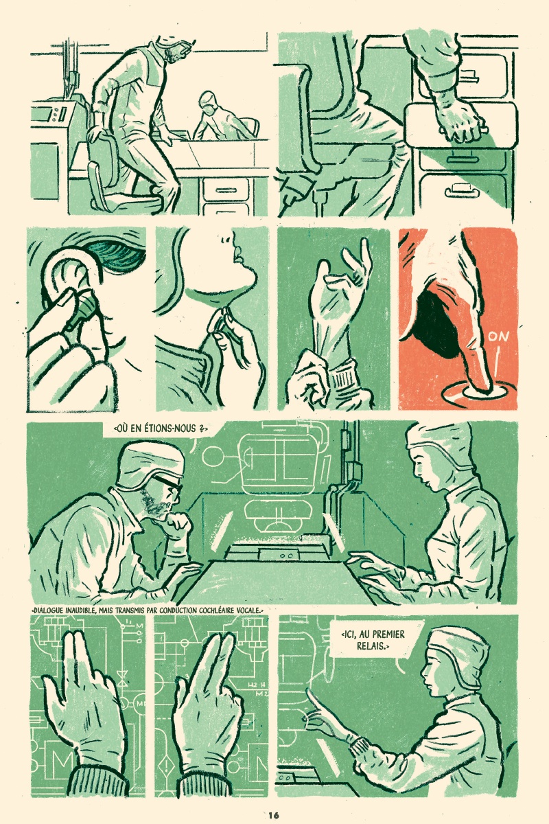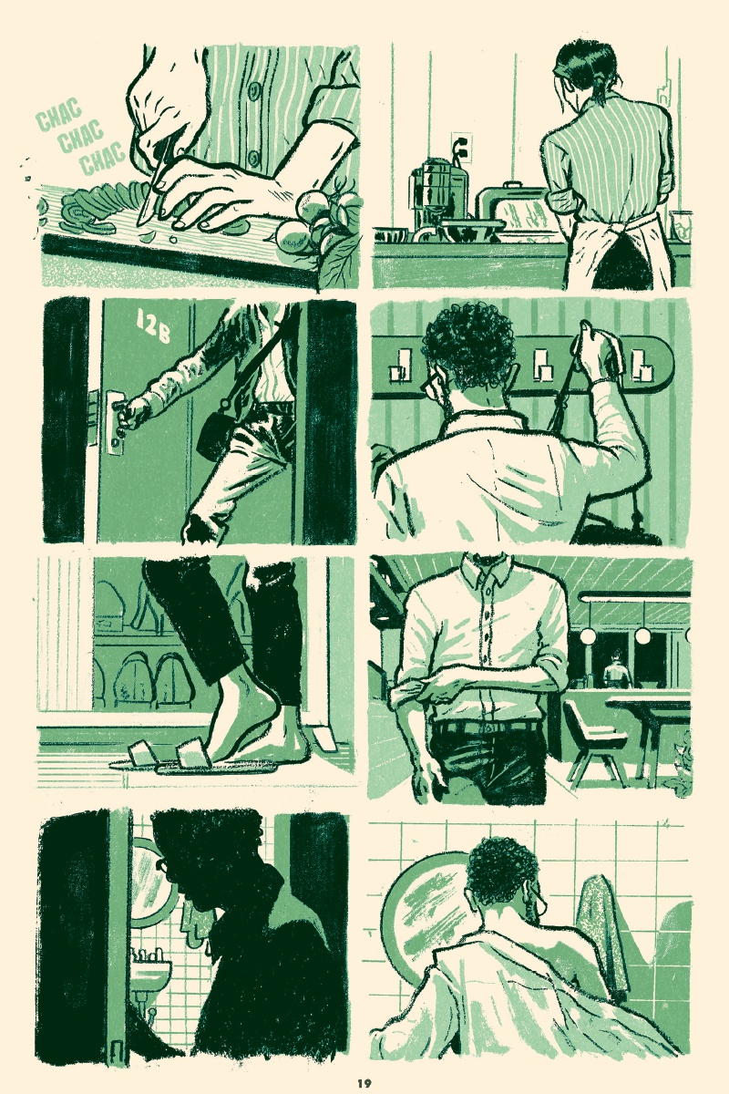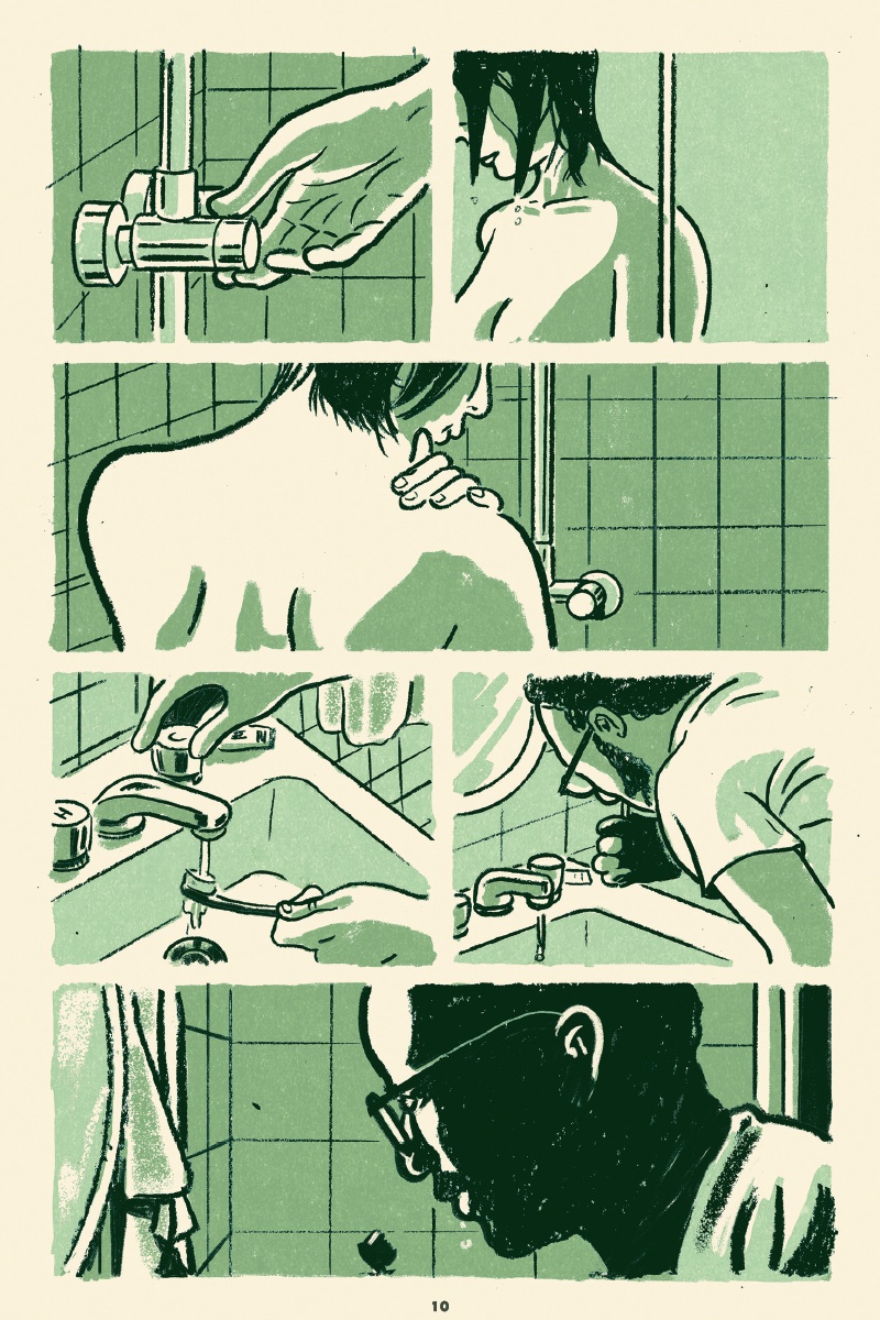 Trait charbonneux, regards fatigués et découpage collé à l’humain, l’approche immersive de Curt Merlo emprunte aux nouvelles télévisées, au cinéma et à la littérature classique. Avant tout, il tape dans le concret, ne laisse passer aucun détail révélateur et accompagne constamment sa distribution. Les vues d’ensemble ou de mise en contexte ne durent jamais plus d’une case ou deux. Mouvement, action continue ou presque, le rythme n’est pas effréné pour autant. L’urgence est indéniable, palpable même, tout en étant contenue. Cette gestion du temps s’avère admirable d’efficacité et de retenue. La mise en couleurs, en bichromie plutôt, est également remarquable. Chaque chapitre a droit à sa teinte primaire, que seuls quelques aplats rouges viennent troubler ici et là, quand les situations s’échauffent. Là aussi, l’astuce technique est simple et totalement maîtrisée.