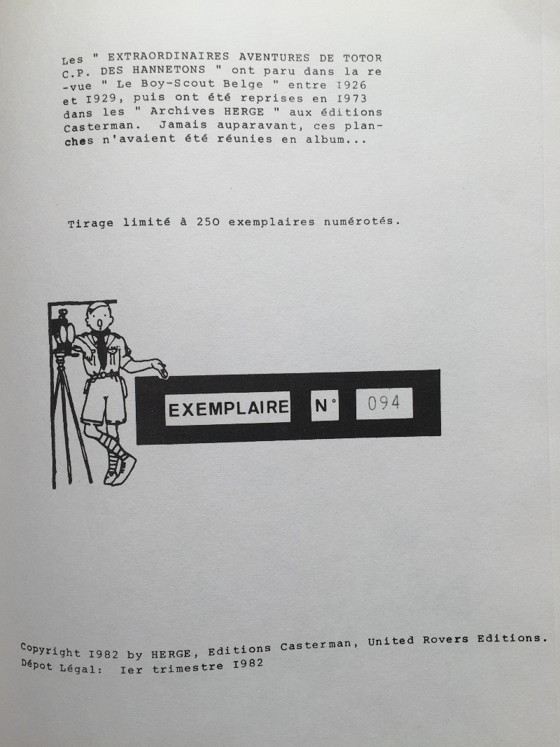 Info édition : 1er et 4ème plats en carton dur. Dos noir. Le 4ème plat présente une petite image collée. Edition en N/B. Tirage à 250 exemplaires. Cette aventure a paru dans la revue "Le Boy-Scout Belge" entre 1926 et 1929, puis a été reprise en 1973 dans les "Archives Hergé" aux éditions Casterman.