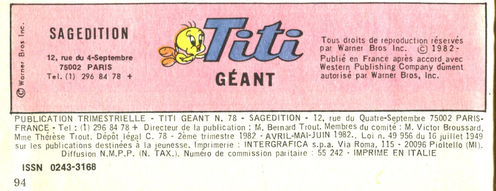 - Info édition : Prix de vente 12 F. Format 18 x26 cm. Inclus un supplément gratuit : Le trésor caché, dans la collection "La forêt qui chante".