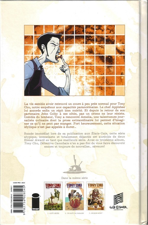 Après un détour exotique par l’île de Yamapalu lors du tome précédent, Tony Chu réintègre sa fonction aux côtés de son coéquipier John Colby et de son chef Mike Applebee. Au menu de cette nouvelle aventure particulièrement distrayante et pourvue de dialogues ciselés, il y a non seulement le retour marquant d’anciens personnages, tels que l’insaisissable Mason Savoy ou l’invincible coq de combat Payo, mais surtout beaucoup de scènes consacrées à la vie privée de Tony. Ce troisième volet permet ainsi de découvrir la famille Chu au complet, mais surtout sa nouvelle petite amie : Amelia Mintz, une chroniqueuse culinaire capable de décrire les plats avec une telle justesse que le lecteur a littéralement l’impression d’avoir les aliments en bouche.
