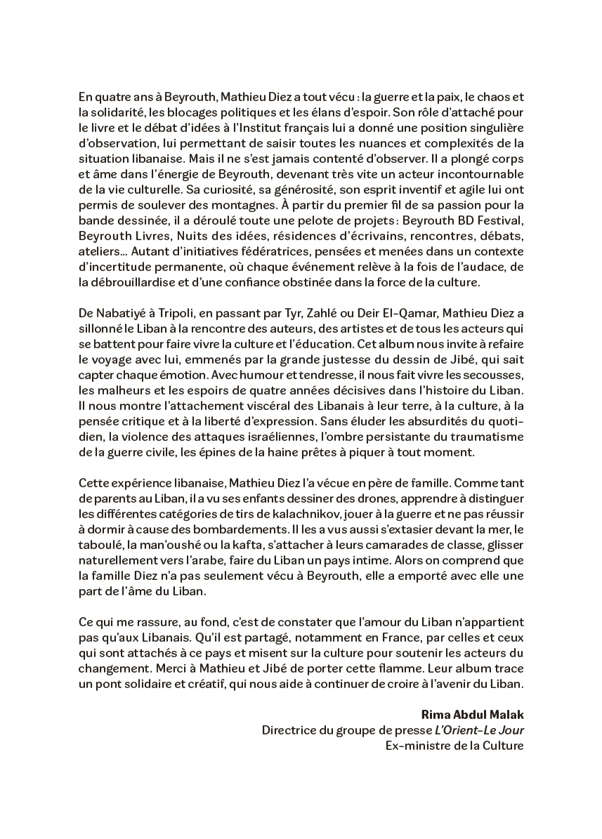 Résumé: Entre carnet de voyage et chronique, Mathieu Diez partage sa découverte du Liban où il s'installe avec sa famille en 2021. Il relate son quotidien et son travail durant 4 années au sein de l'ambassade de France, jusqu'à la guerre d'octobre 2024.