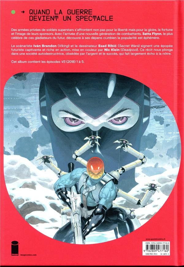 Esad Ribic est un de mes dessinateurs chouchou depuis ma lecture du fantastique Thor: le massacreur de dieux et les graphic novels qu'il a sorti sur Loki, Silver surfer et Namor. Capable de l’exceptionnel comme de l'assez banal, ses dessins ont néanmoins toujours une ambiance unique, barbare et éthérée, que j'adore. Mercenaire de Marvel depuis des années, pour lequel il produit un nombre important de couvertures, toutes superbes, Ribic propose avec VS son premier comic indépendant, peut-être lassé par une industrie qui ne permet plus à des auteurs de proposer de beaux albums finis... Panini sort très rapidement sa traduction dans une édition identique à l'originale, avec la maquette particulière qui intègre intelligemment l'atmosphère télévisuelle aux chapitres de la BD et ajoute les couvertures originales et alternatives en fin de volume. Sur une planète futuriste les conflits armés sont devenus un spectacle télévisé jouissant d'une audience record et sponsorisés par une foule de produits. Tout se vends, tout s'achète. Satta Flyn est le meilleur soldat de la garde industrielle. Voici ses chroniques... Je ne vais pas vous cacher que je n'ai pas compris grand chose à cette histoire... Est-ce d'ailleurs bien un one-shot? Rien ne le confirme ni ne l'infirme et j'espère sincèrement qu'un tome deux viendra expliciter quelque peu cette intrigue très obscure. Mais y a t'il seulement une intrigue ou le projet n'est-il pas plutôt de dépeindre les chroniques d'une société du spectacle publicitaire? Car sur ce point l'affaire est tout à fait réussie avec une omniprésence de messages d'annonceurs qui rappellent les films de Paul Verhoeven et le récent Il faut flinguer Ramirez qui proposait comme ici de fausses publicités pleine page. Dans VS ces publicités sont placées idéalement comme pages de transition entre les chapitres, véritables intermèdes dans l'histoire. Bien vu! On découvre ainsi au fil de la lecture de nombreux messages par des bulles et icônes qui nous maintiennent dans cette omniprésence de l'intervention commerciale, du sponsor, sans jamais savoir si nous voyons à travers un écran de diffusion ou la réalité. Les BD traitant de Big Brother ou de l'hyperconsommation publicitaire sont nombreuses mais je n'avais jamais autant été immergé dans cette ambiance par des planches elles-mêmes. Ainsi nous voyons des soldats, entre le sportif et le gladiateur, soutenus par des sponsors qui peuvent décider au gré des choix des actionnaires de retirer leur soutien financier et l'équipement de haute technologie qui va avec. Le héros, amputé de la jambe, peut soudainement se retrouver infirme et le lendemain champion pour peu qu'il ait trouvé une autre écurie. L'autre réussite est graphique, notamment le design des combattants et l'univers général hyper technologique que maîtrise Ribic depuis longtemps, avec ces arrières-plans brumeux laissant entrevoir de colossaux vaisseaux lardés de halos lumineux provenant des hublots et balises, que l'on voit souvent dans ses albums. C'est réchauffé mais que c'est puissant! Le découpage est généreux, avec un album d'un format ni trop gros ni trop court, des pleines pages et surtout cette science du mouvement, du cadrage dans laquelle le croate excelle. Et j'en reviens donc à l'histoire, sans quoi on frôlerait l'album parfait (un message, des dessins, et...). Car hormis le démarrage avec de très belles séquences d'action en mode squad militaire SF dirigé par un héros qui déchire avec ses bras robotiques d'appoint très classes, on ne sait pas bien ce que l'on lit. Une description de sa vie de super-soldat, de son contexte, mais une gestion du temps tout à fait opaque (est-on avant, pendant, après?), le scénariste nous instillant par une bulle ici des infos qui seront contredites par la séquence d'après et surtout aucun élément pour attraper une linéarité. Du coup on voit combattre Satta comme un vieux soldat rouillé sans que l'on sache comment on est passé du statut de héros à celui de raté. Est-ce que l'héroïsme était fictif, qu'il le devait au talent de ses adjoints? Est-ce que le temps a passé? Est-il toujours en vie? Est-il un clone? Beaucoup de questions se posent, souvent riches, permettant d'aller dans plein de directions... mais sans rien pour valider une thèse. Du coup ça fait mal à la tête et on finit par perdre totalement le fil à se désintéresser du personnage, pourtant très charismatique. L'atmosphère militaro-spatial, le graphisme unique de Ribic, justifient pour moi la lecture de cet album mais on a tout de même ici un gros gâchis sur un projet qui avait tout pour donner une BD majeure. Je dis souvent sur ce blog que je suis particulièrement attaché aux dessins. Mais quand on en vient à oublier carrément de construire une intrigue il est difficile de garder une cohérence à un projet. Dommage. Lire sur le blog: https://etagereimaginaire.wordpress.com/2019/05/08/vsBDGest 2014 - Tous droits réservés