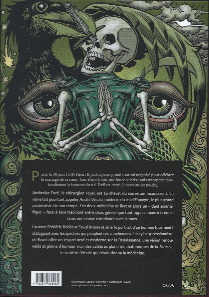 Résumé: Paris, le 30 juin 1559, Henri II participe au grand tournoi organisé pour célébrer le mariage de sa soeur. Lors d'une joute, une lance se brise puis transperce profondément le heaume du roi. L'oeil est crevé, le cerveau est touché. Ambroise Paré, le chirurgien royal, est au chevet du souverain inconscient. La reine fait pourtant appeler André Vésale, médecin du roi d'Espagne, le plus grand anatomiste de son temps. Les deux médecins se livrent alors un « duel scientifique », face-à-face fascinant entre deux génies que tout oppose mais ici réunis dans une danse troublante avec la mort. Laurent-Frédéric Bollée et Fawzi brossent ainsi le portrait d'un homme tourmenté dialoguant avec les spectres qui peuplent ses cauchemars. Le style expressionniste de Fawzi offre un regard neuf et moderne sur la Renaissance, une vision renouvelée et pleine d'humour noir des célèbres planches anatomiques de la Fabrica, le traité de Vésale qui révolutionna la médecine.