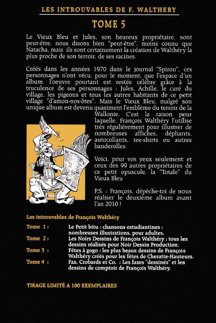 Édition à tirage limité à 100 ex. Pas de DL. Les Introuvables de F. Walthéry Tome 5 . Illustrations d'affiches, dépliants, autocollants, tee-shirts ou autres banderolles.