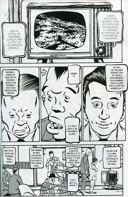 Nous sommes plongés dans le Japon des années 60 dans la moiteur d'une station balnéaire aux allures de Las Vegas. Il s'agit d'une enquête policière un peu particulière mené par un jeune et irréprochable inspecteur. Visiblement, celui-ci va être en proie à des hallucinations qui vont le mener sur la lune. D'ailleurs, celle-ci va jouer un grand rôle sur fond de course spatial entre les différentes grandes puissances pour poser le premier pas. Le titre ne trompe pas. Il y a une certaine originalité dans la façon dont vont se dérouler les événements. C'est également une bd d'atmosphère avec une multitude de détails dans le décors. Il faut dire que c'est fort bien dessiné avec une certaine précision du trait que j'admire. Par contre, au fil de ma lecture, je me suis un peu perdu au gré des déambulations de notre inspecteur. Il faudra s'accrocher. A noter que Wet Moon a reçu le Prix Asie de la Critique ACBD 2014.BDGest 2014 - Tous droits réservés