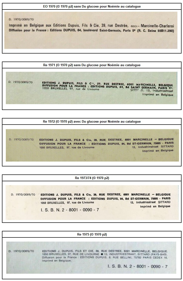 - Info édition : Dos rond, noté ©1970 en page 2, adresse mentionnée au 4e plat pour la France : DIFFUSION POUR LA FRANCE : EDITIONS DUPUIS, 84, Bd ST- GERMAIN, 75005 – PARIS (avec ISBN)