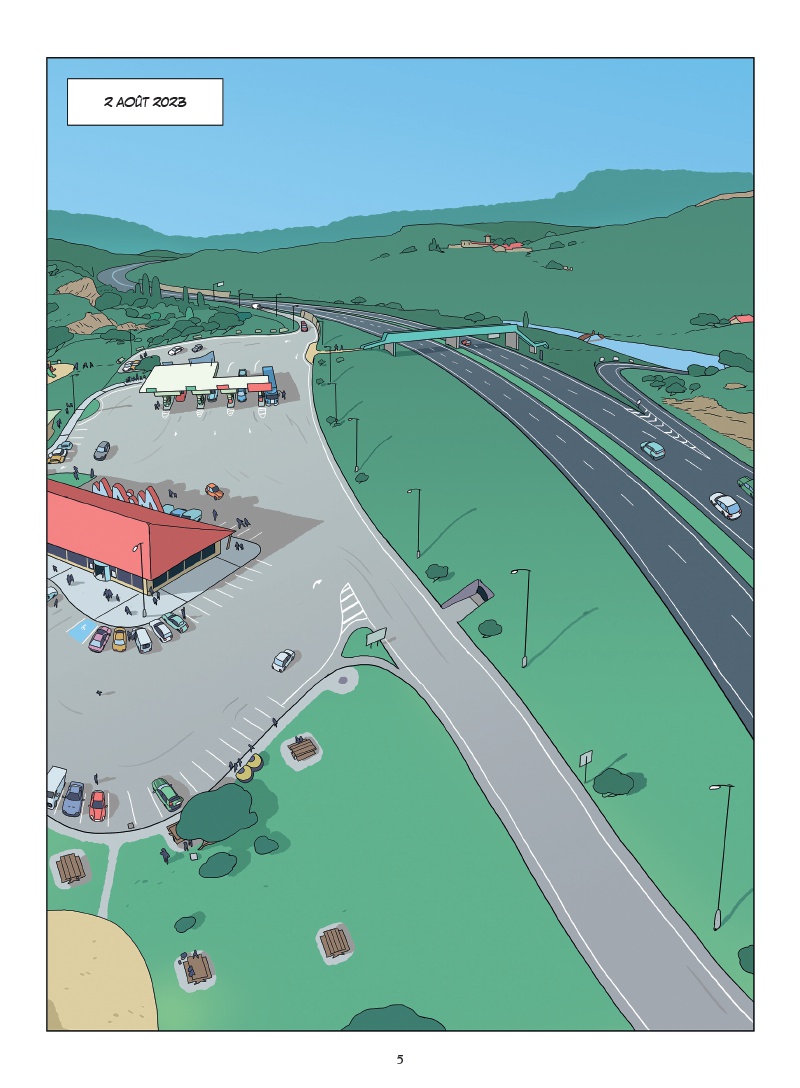 Les vacances ! Enfin ! Baignades, promenades et rigolades, nous voilà ! Mais avant ça, il reste à surmonter la route et ses kilomètres de bitume. À bord du break Volvo, la famille tue le temps et les parents occupent leurs trois filles comme ils le peuvent. On plaisante, on joue, les paysages défilent et se transforment. Mila et Samantha, les deux plus jeunes, s'endorment rapidement. Jolène, l'aînée, pourrait prendre le volant afin de pratiquer sa conduite accompagnée, mais elle préfère une option plus tranquille : sa console portable. Les tunnels s'enchaînent et l'équipage roule désormais le long d'un lac vert turquoise entouré de falaises abruptes. Une ambiance étrange règne sur cette route. Le GPS a perdu son signal, l'heure du déjeuner approche et, cerise sur le gâteau, Samantha se réveille avec une envie pressante. Subitement, un bolide noir les dépasse à une vitesse phénoménale dans un vacarme assourdissant. La famille est sous le choc, d'autant qu'un deuxième les surprend à nouveau et stoppe à leur hauteur. Une silhouette noire et casquée s'extrait du véhicule en hurlant des paroles insensées. Les trois soeurs sont effrayées par ce chauffard délirant semblant tout droit sorti des enfers. Ils n'en sauront pas davantage, car l'homme, distrait par la famille, se fait faucher par un 3e monstre de métal identique aux deux autres. Après quelques kilomètres parcourus prudemment, les passagers du break Volvo doivent se rendre à l'évidence : ils sont perdus et pris au piège au beau milieu d'une poursuite infernale...