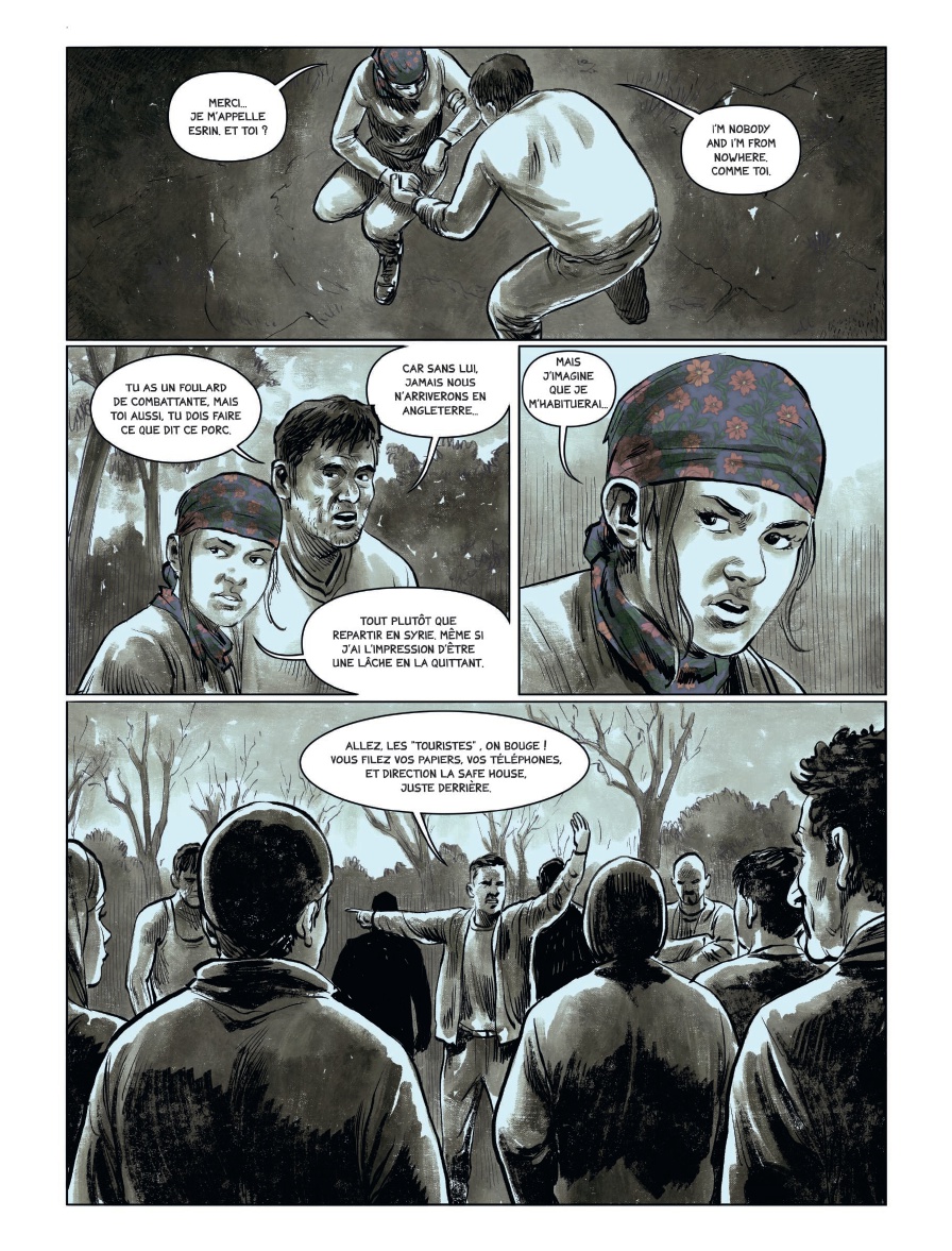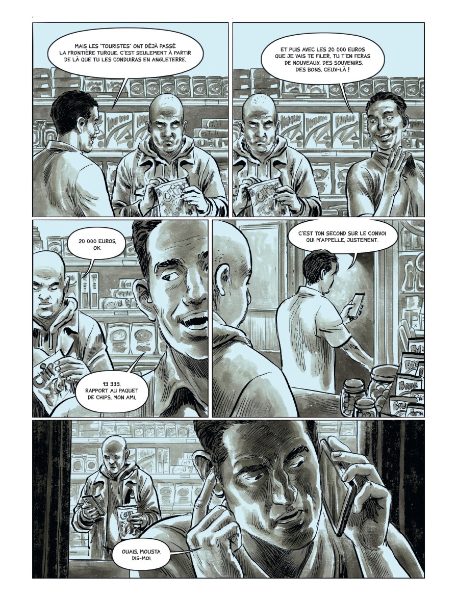 war le taiseux porte des baskets de luxe grâce à son lucratif job de passeur. Mais il porte aussi un douloureux passé que va réveiller Esrin, une jeune migrante kurde, fille de combattante fuyant l'enfer syrien. Laisser renaître son humanité ou pas ? Awar va devoir choisir... Car Soran, son boss, veut du chiffre et du résultat. Et Awar, plus tout jeune, voit bien que Musta, passeur ultraviolent fraîchement arrivé, lui prendrait volontiers sa place... Awar va-t-il oser prendre la porte de la rédemption ou la claquer définitivement ?