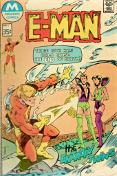 Origin and first appearance of E-Man (Alec Tronn, an energy being from space), his girlfriend Nova Kane and The Brain from Alpha Centauri; E-man is a pure energy form curiously roaming the universe when he stumbles on a ship controlled by a large brain; the Brain releases a gas bomb that will destroy planet earth but E-man thwarts the attempt accidentally while transforming himself into a robot slave.